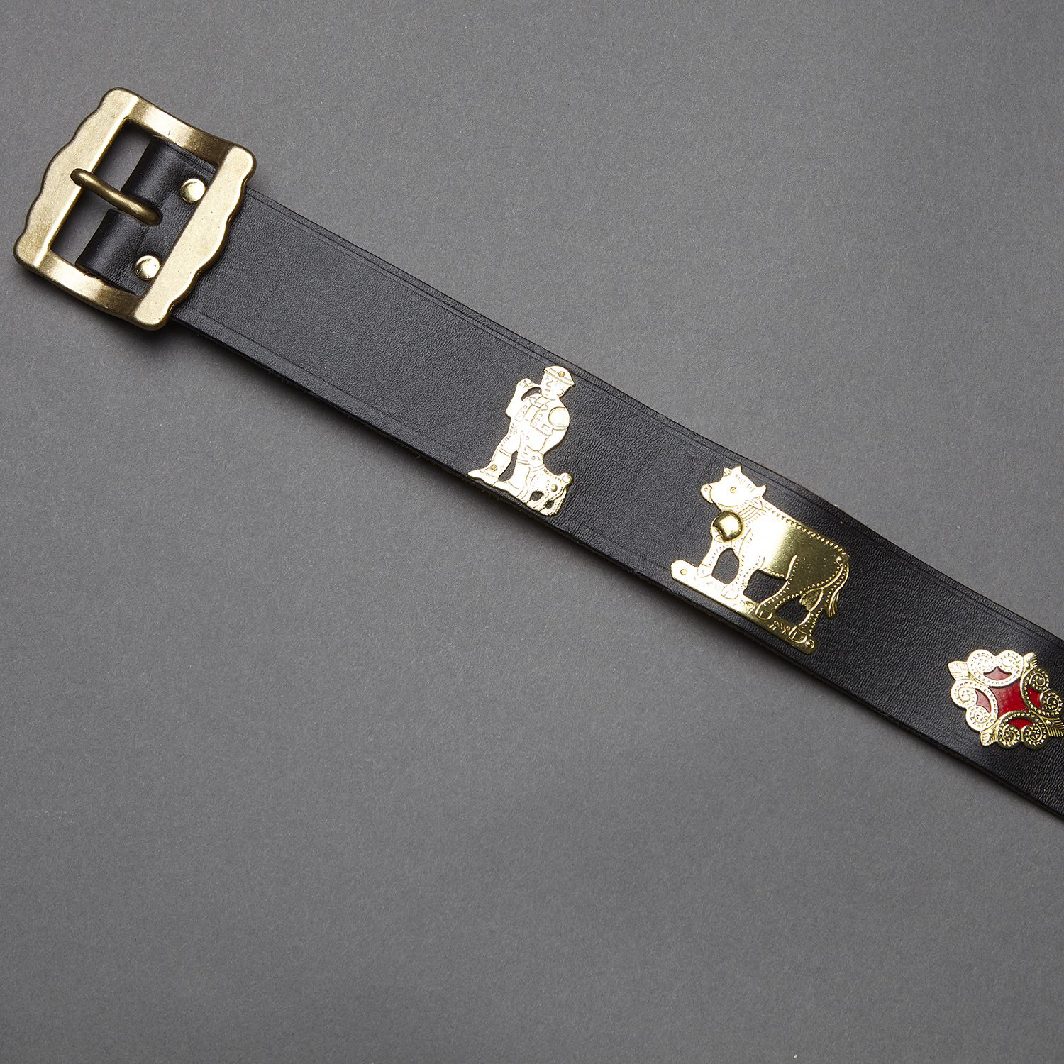 100% cuir, noir, motifs en laiton doré, inclusion cuir rouge dans la rosette