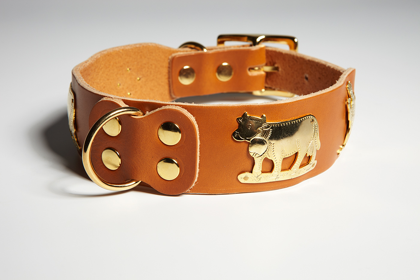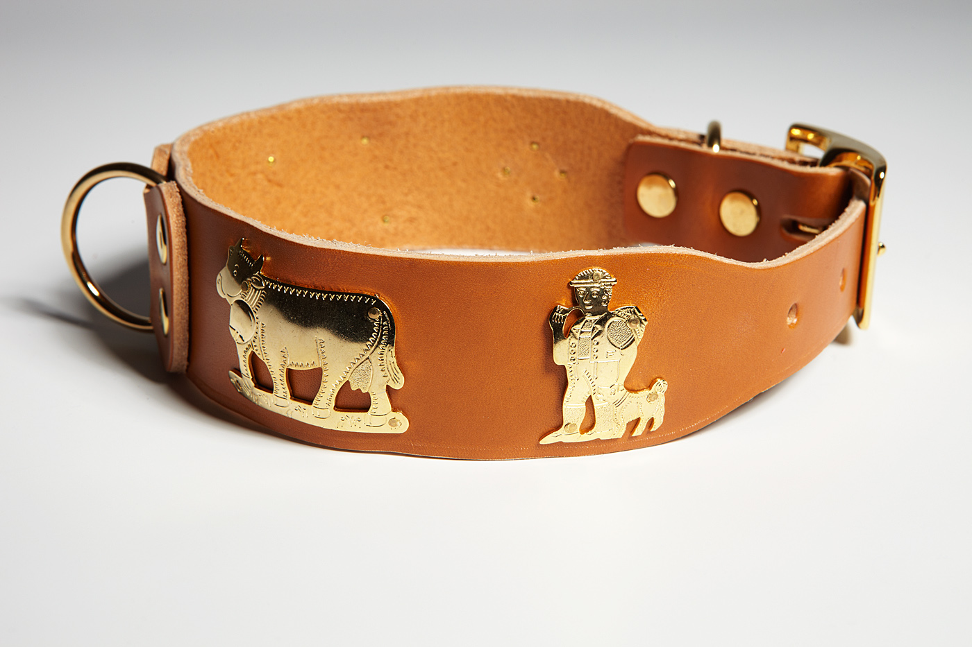 Collier pour chien en cuir couleur miel, forme large, motifs appenzellois rouges